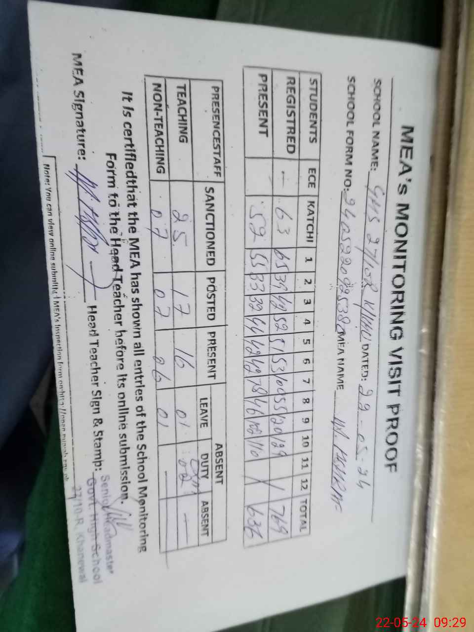 | Attendance Register | Head Teacher | MEA with School | Visit Proof |