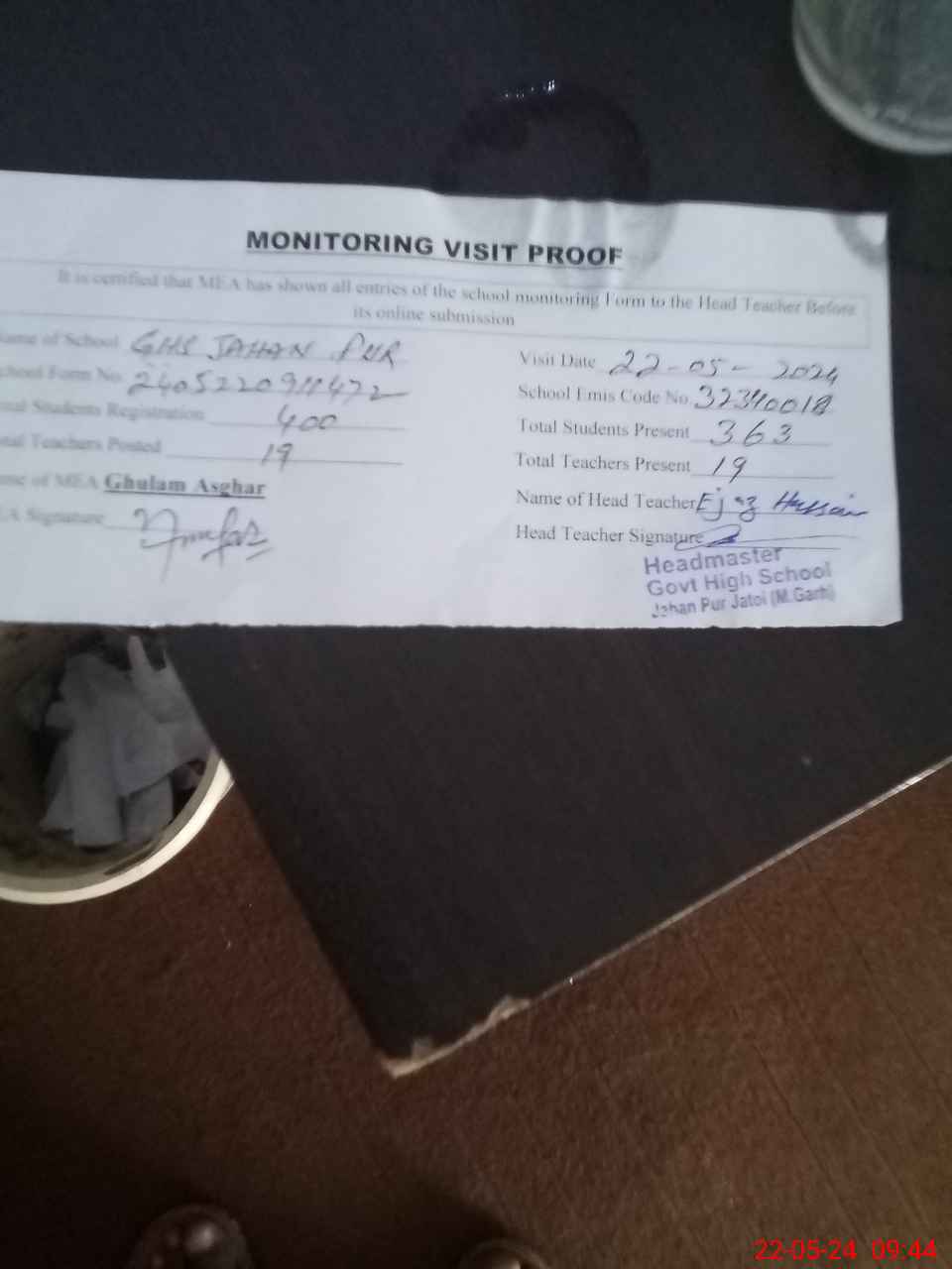 | Attendance Register | Head Teacher | MEA with School | Visit Proof |