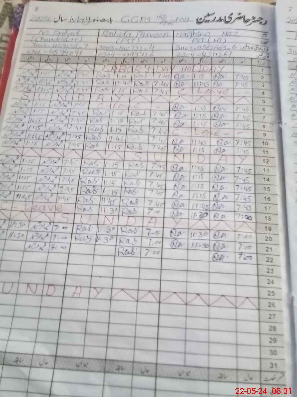 | CNIC | Full Name | Designation | R/C | Absence During Last Calender Month |