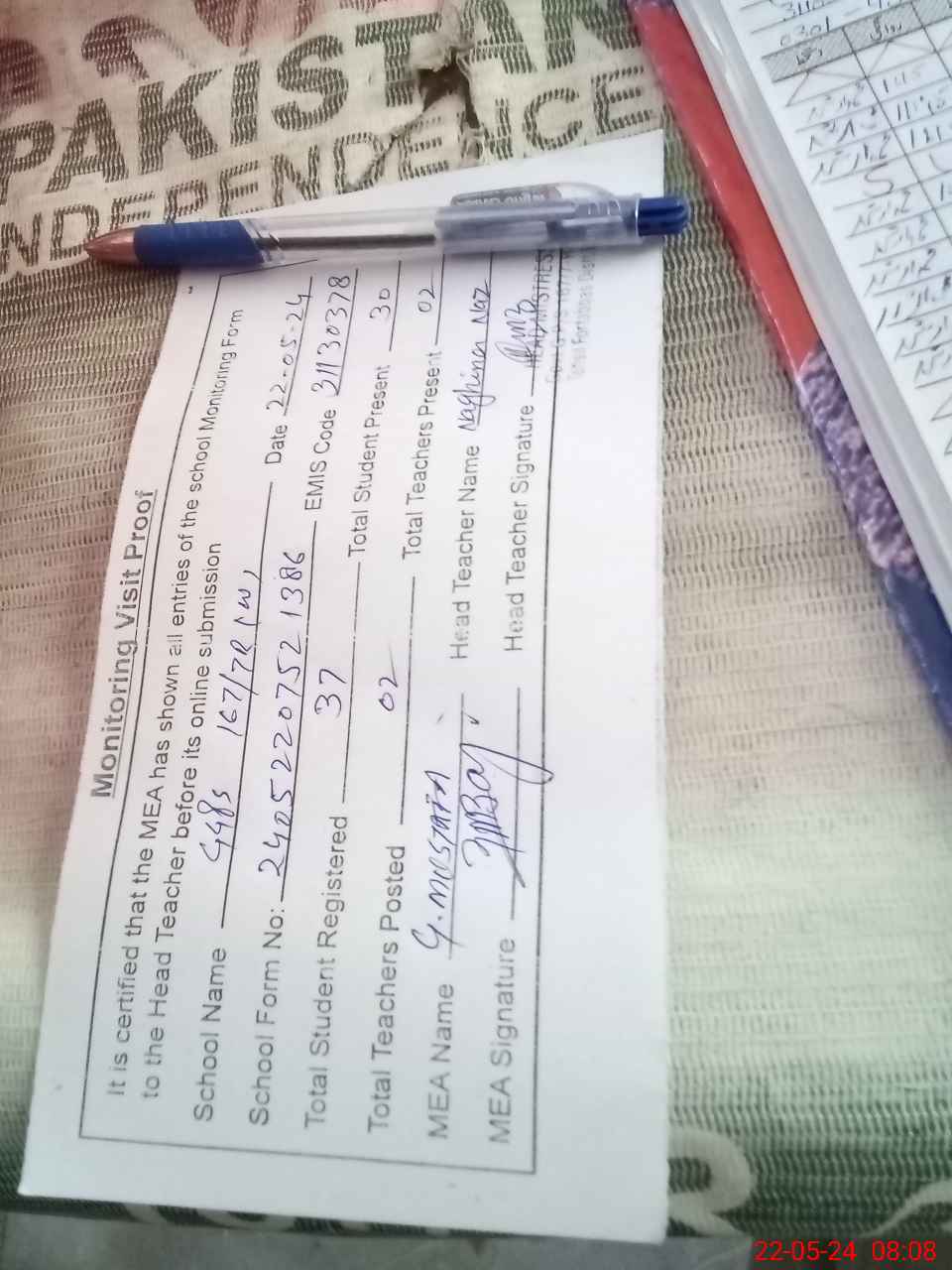 | Attendance Register | Head Teacher | MEA with School | Visit Proof |