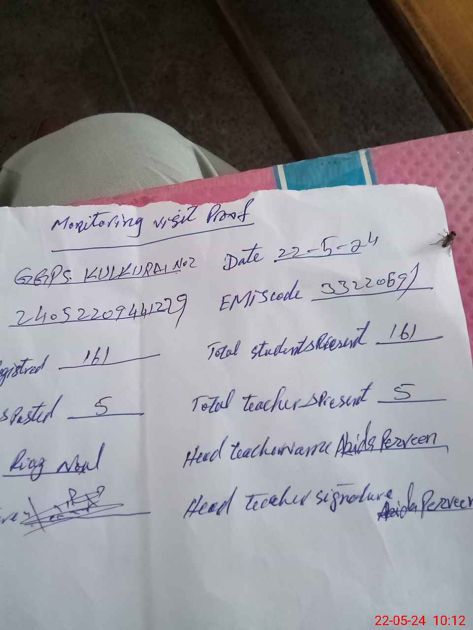 | Monitoring Date: 22-05-2024 | Start Time: 22-05-2024 09:17 AM | End Time: 22-05-2024 10:14 AM | Name of MEA: J-**** MU**** RI**** | |