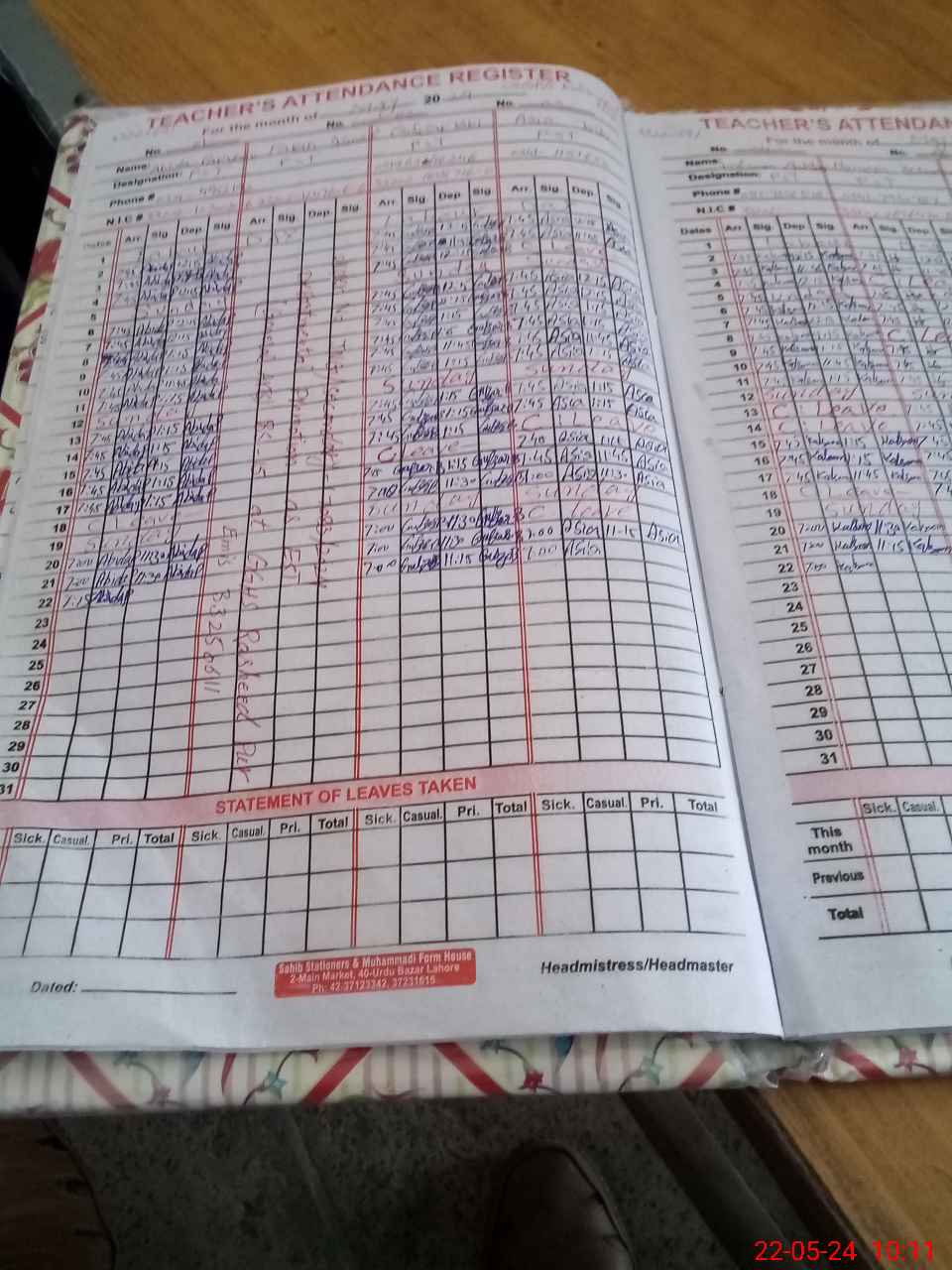 | CNIC | Full Name | Designation | R/C | Absence During Last Calender Month |