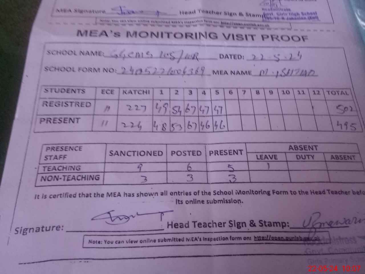 | Attendance Register | Head Teacher | MEA with School | Visit Proof |