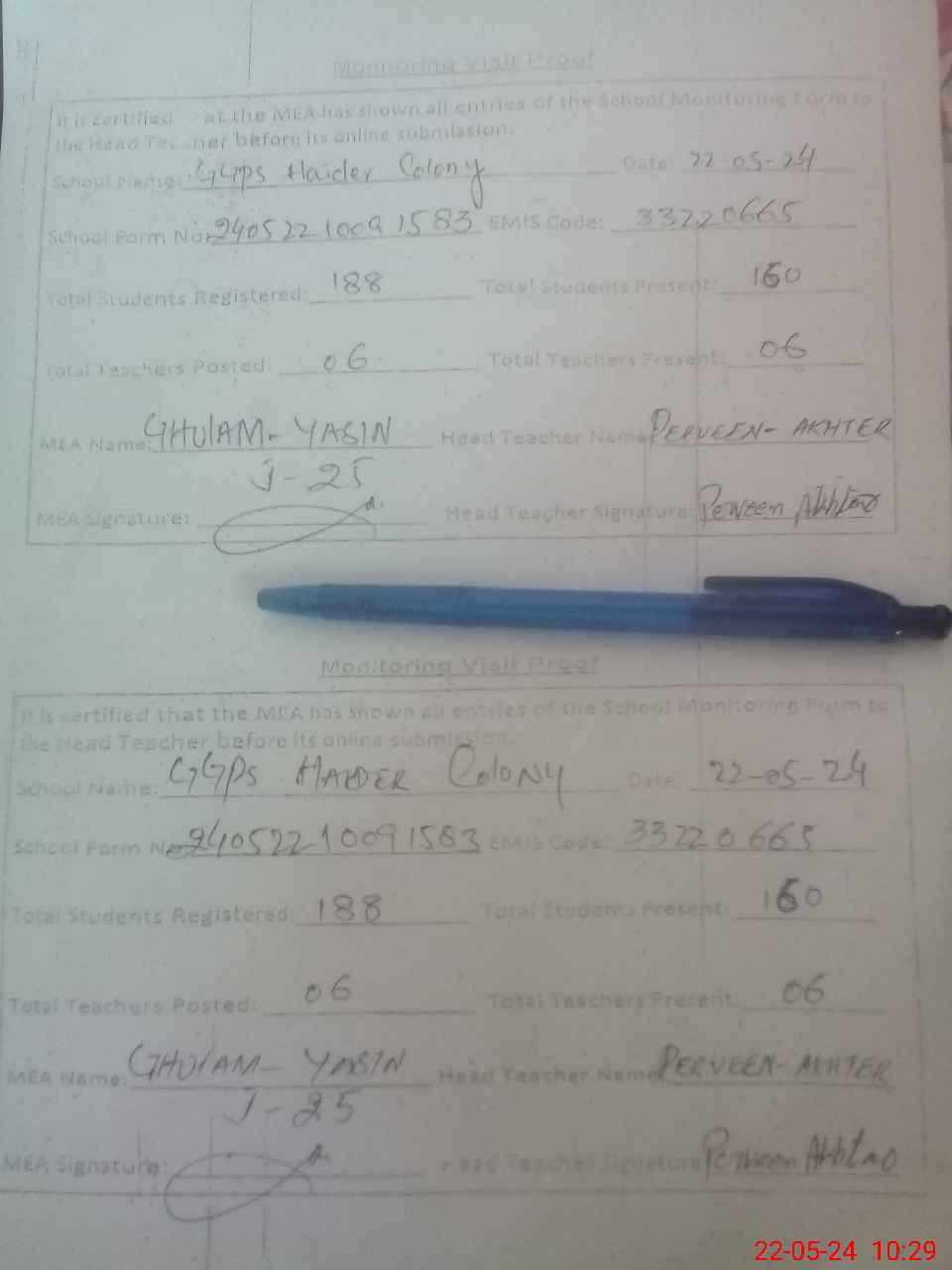 | Attendance Register | Head Teacher | MEA with School | Visit Proof |