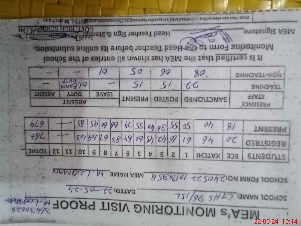 | Attendance Register | Head Teacher | MEA with School | Visit Proof |