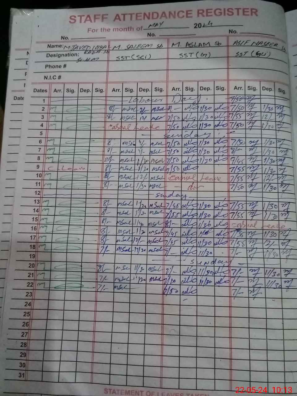 | CNIC | Full Name | Designation | R/C | Absence During Last Calender Month |