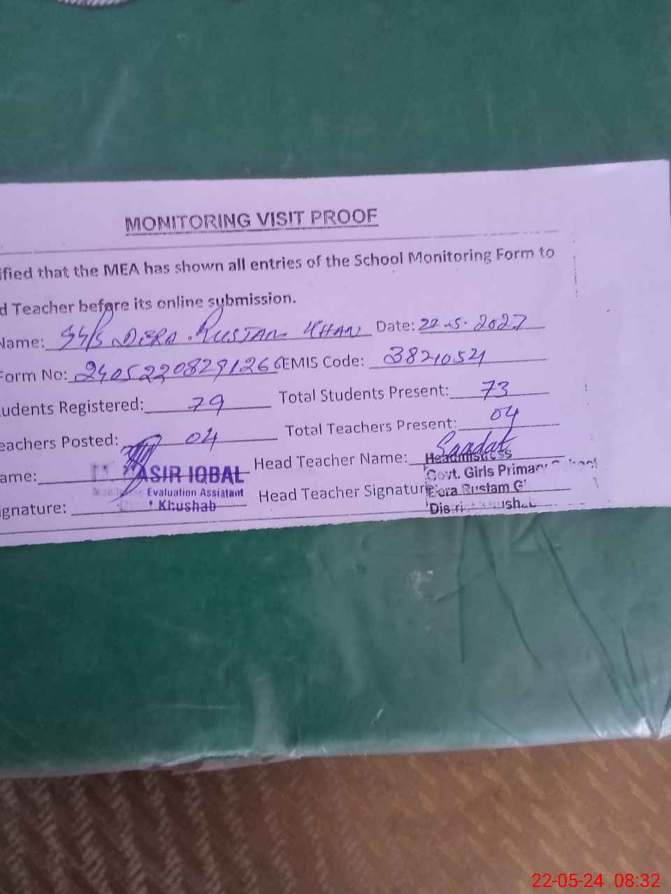 | Attendance Register | Head Teacher | MEA with School | Visit Proof |