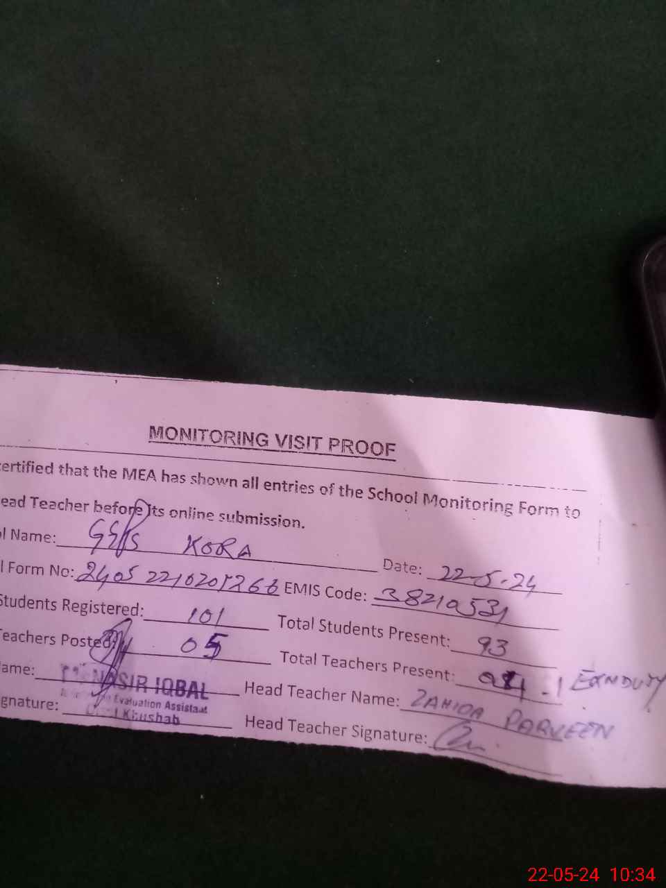 | Name: Za**** Pa**** Bh**** Designation: (School Headmaster's/Headmistress's) Est (V) Phone/Cell Number: 03**** |