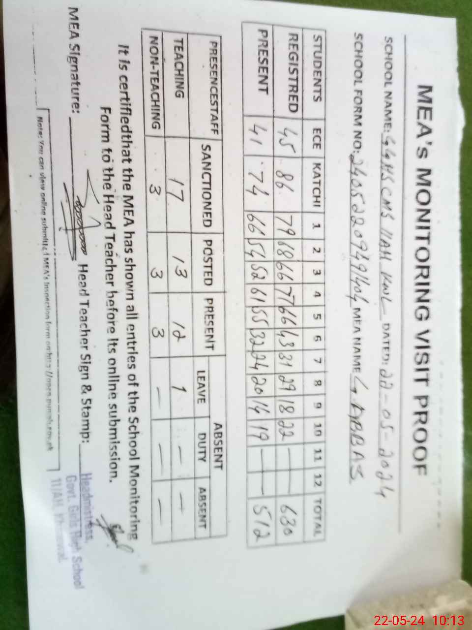 | Monitoring Date: 22-05-2024 | Start Time: 22-05-2024 09:29 AM | End Time: 22-05-2024 10:18 AM | Name of MEA: GH**** AB**** | |