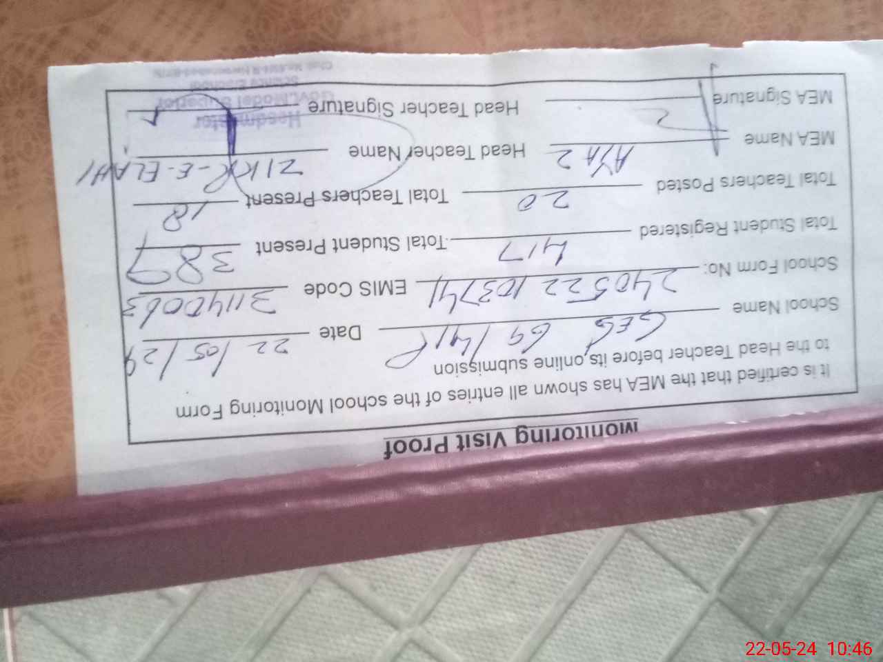 | Attendance Register | Head Teacher | MEA with School | Visit Proof |
