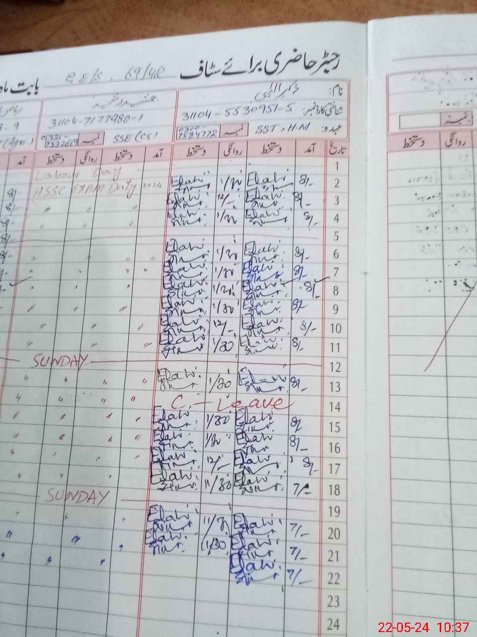 | CNIC | Full Name | Designation | R/C | Absence During Last Calender Month |
