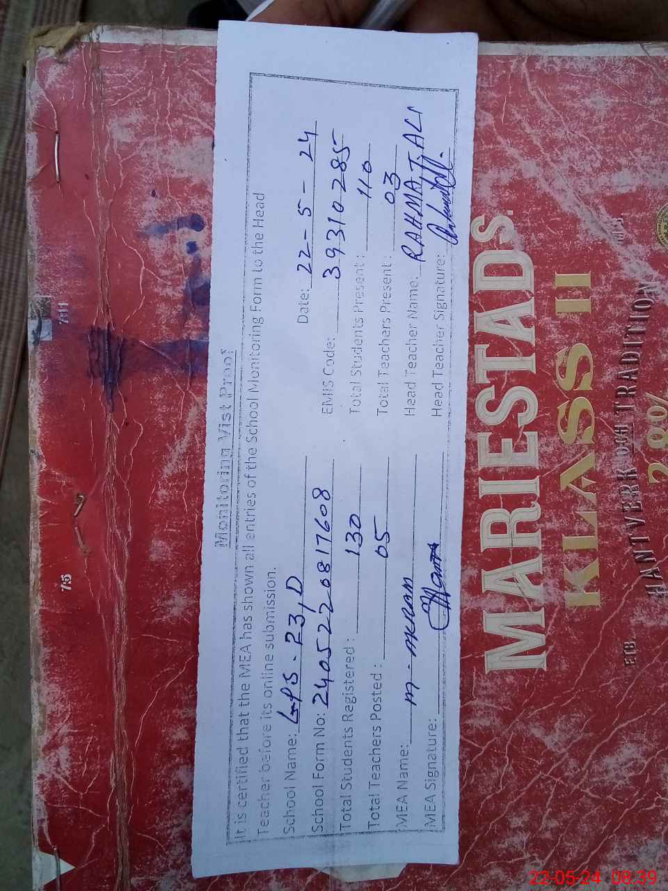 | Attendance Register | Head Teacher | MEA with School | Visit Proof |