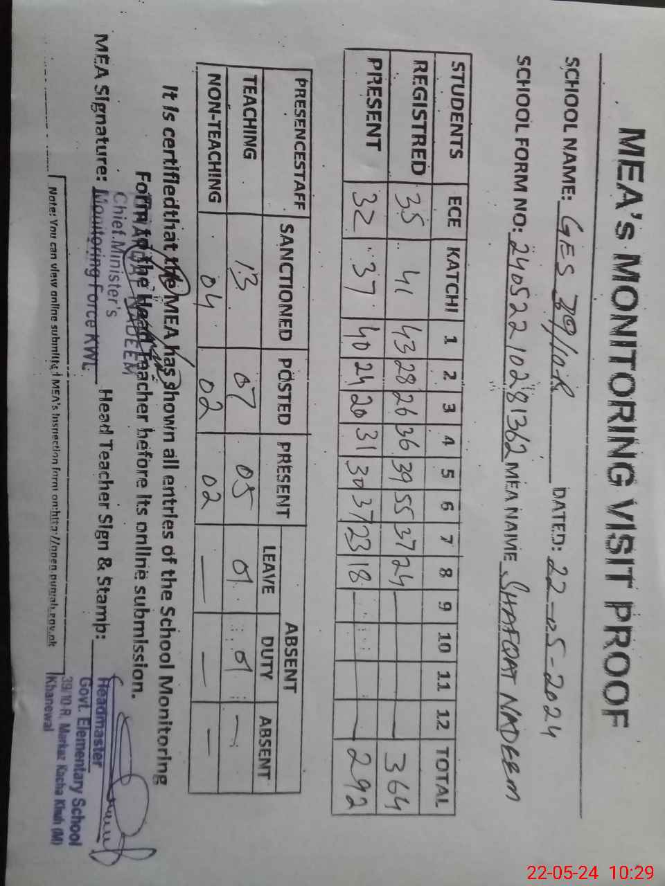 | Certified that this School was Inspected by the Undersigned MEA/DMO Today and the Information Stated Above is as Per Record. | |||||