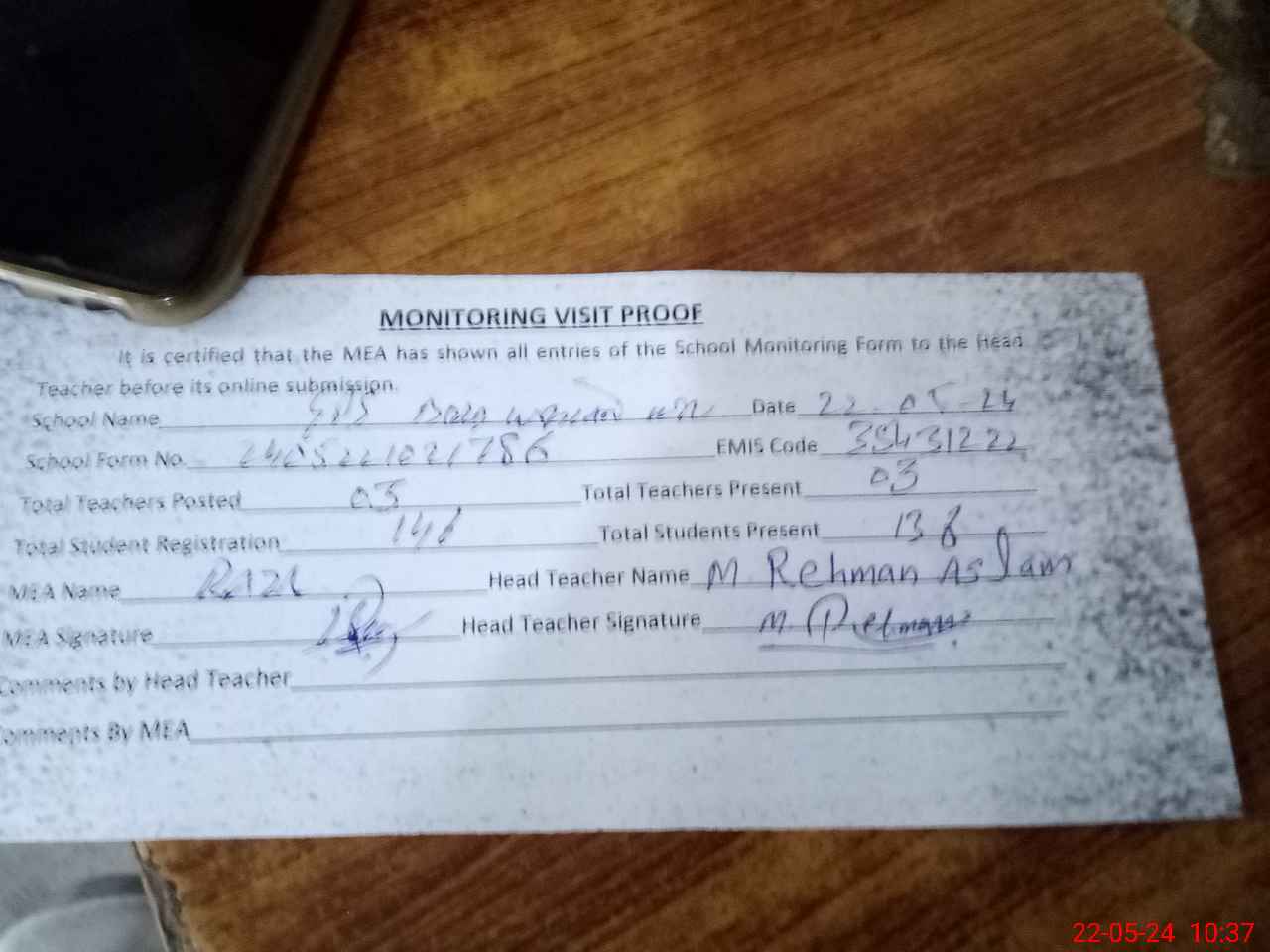 | Attendance Register | Head Teacher | MEA with School | Visit Proof |