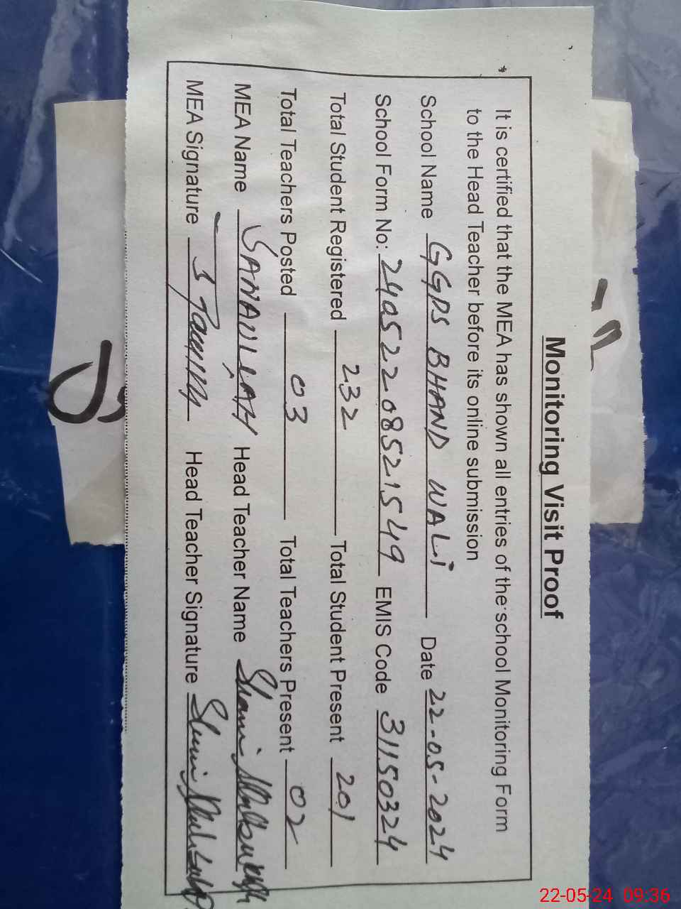 | EMIS Code: 31150324 | Name of School: GGPS BHAND WALI | |||