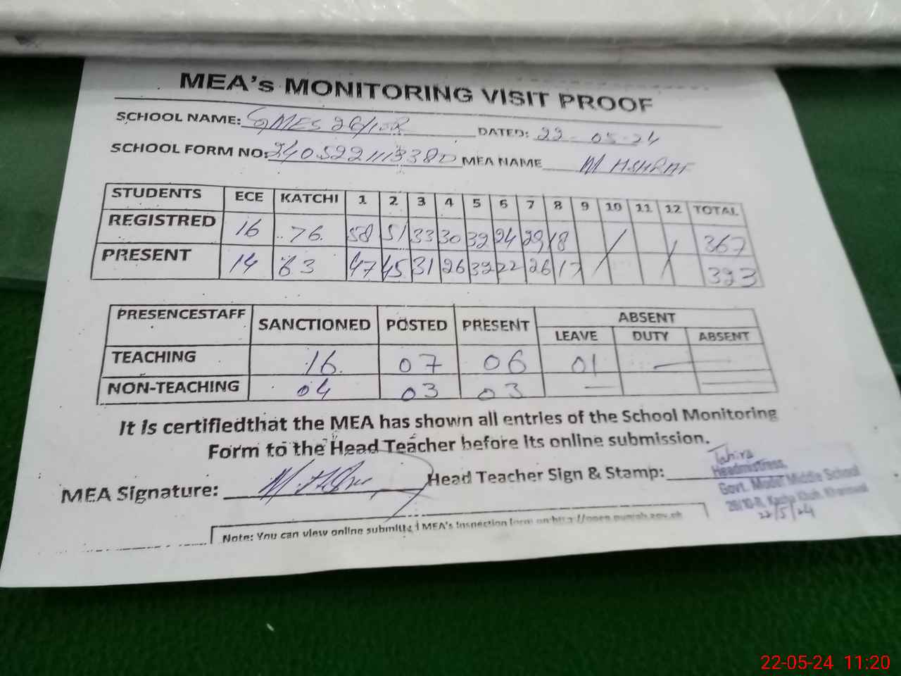 | Attendance Register | Head Teacher | MEA with School | Visit Proof |