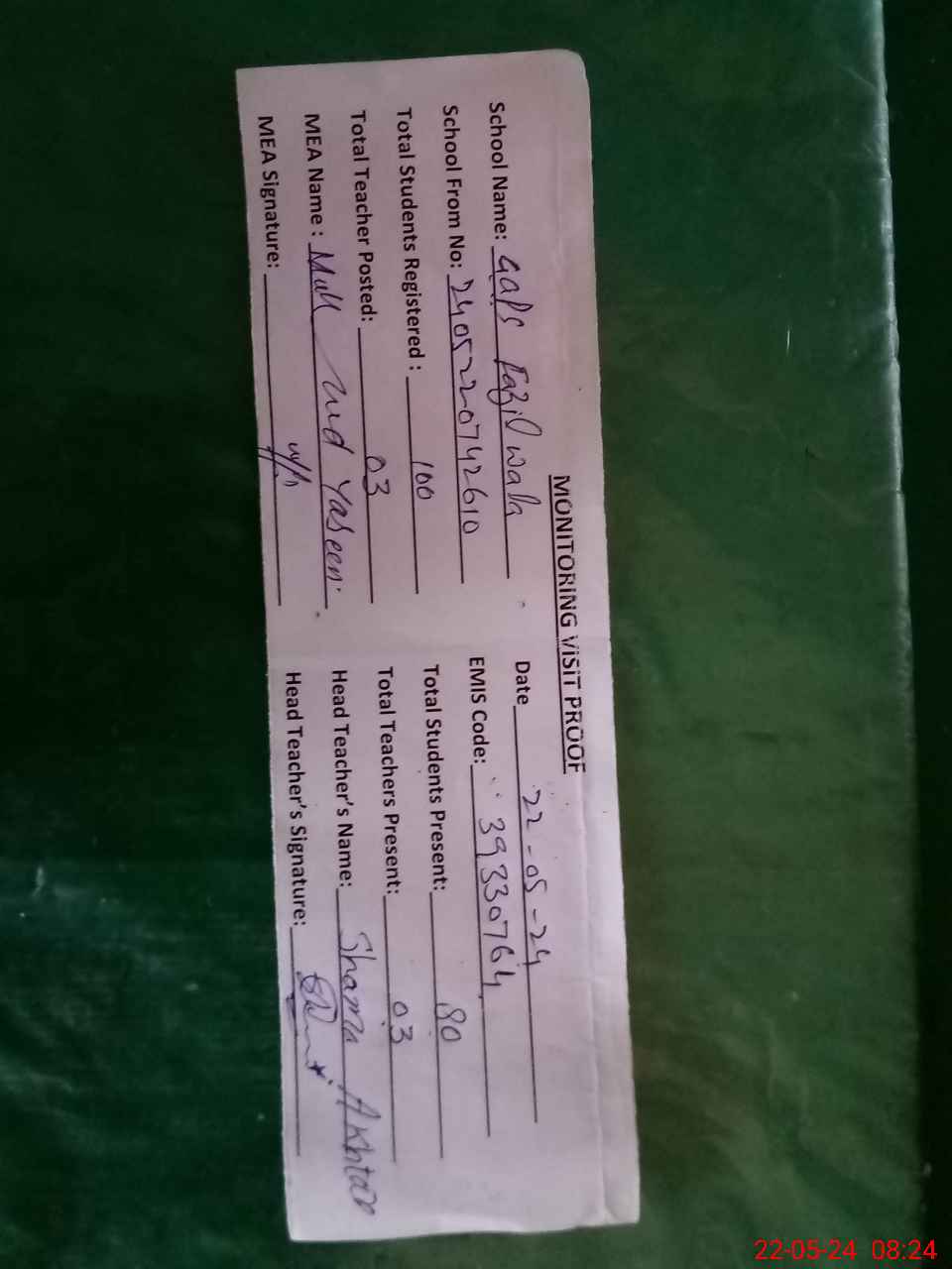 | Attendance Register | Head Teacher | MEA with School | Visit Proof |