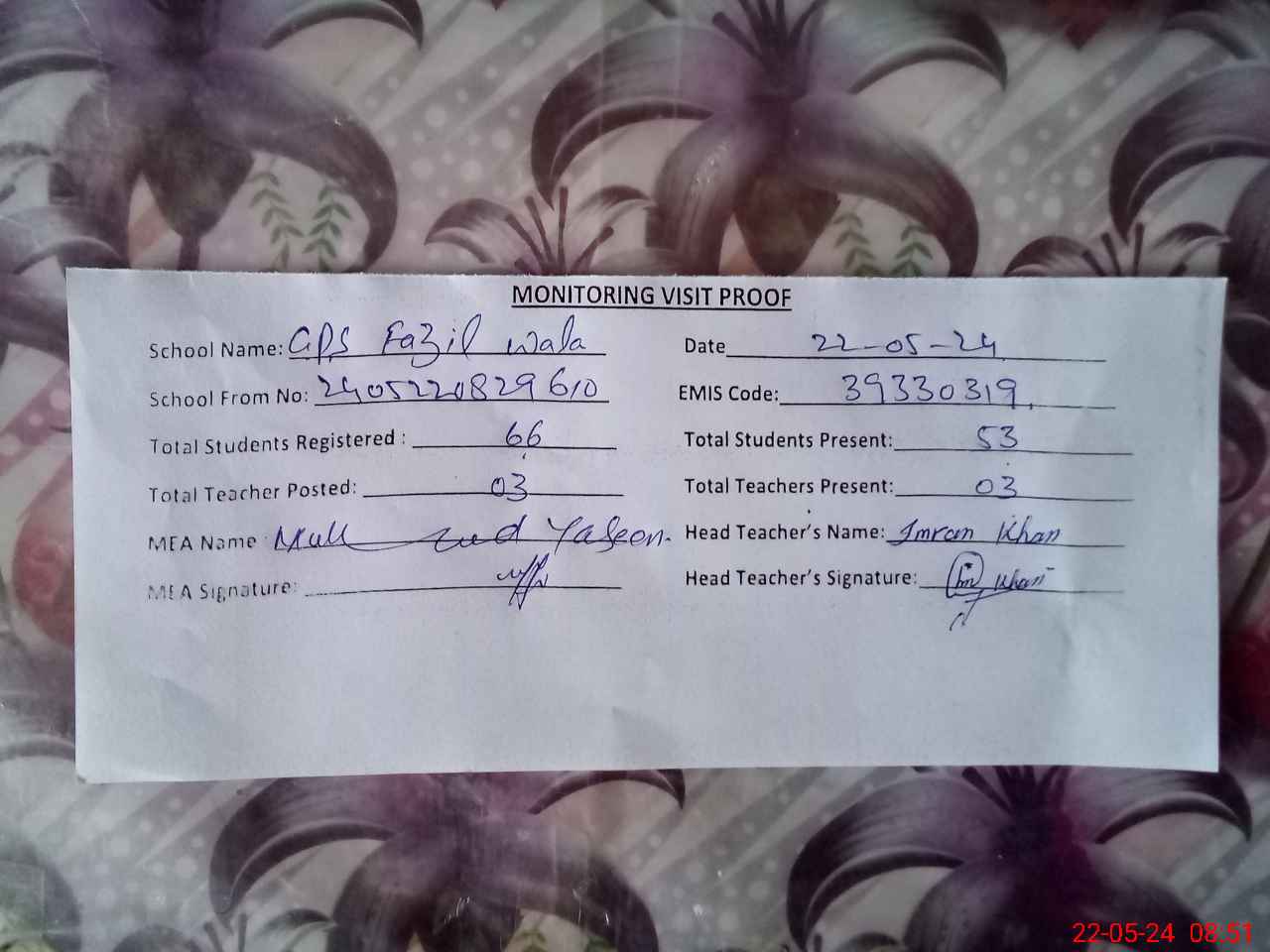 | Attendance Register | Head Teacher | MEA with School | Visit Proof |