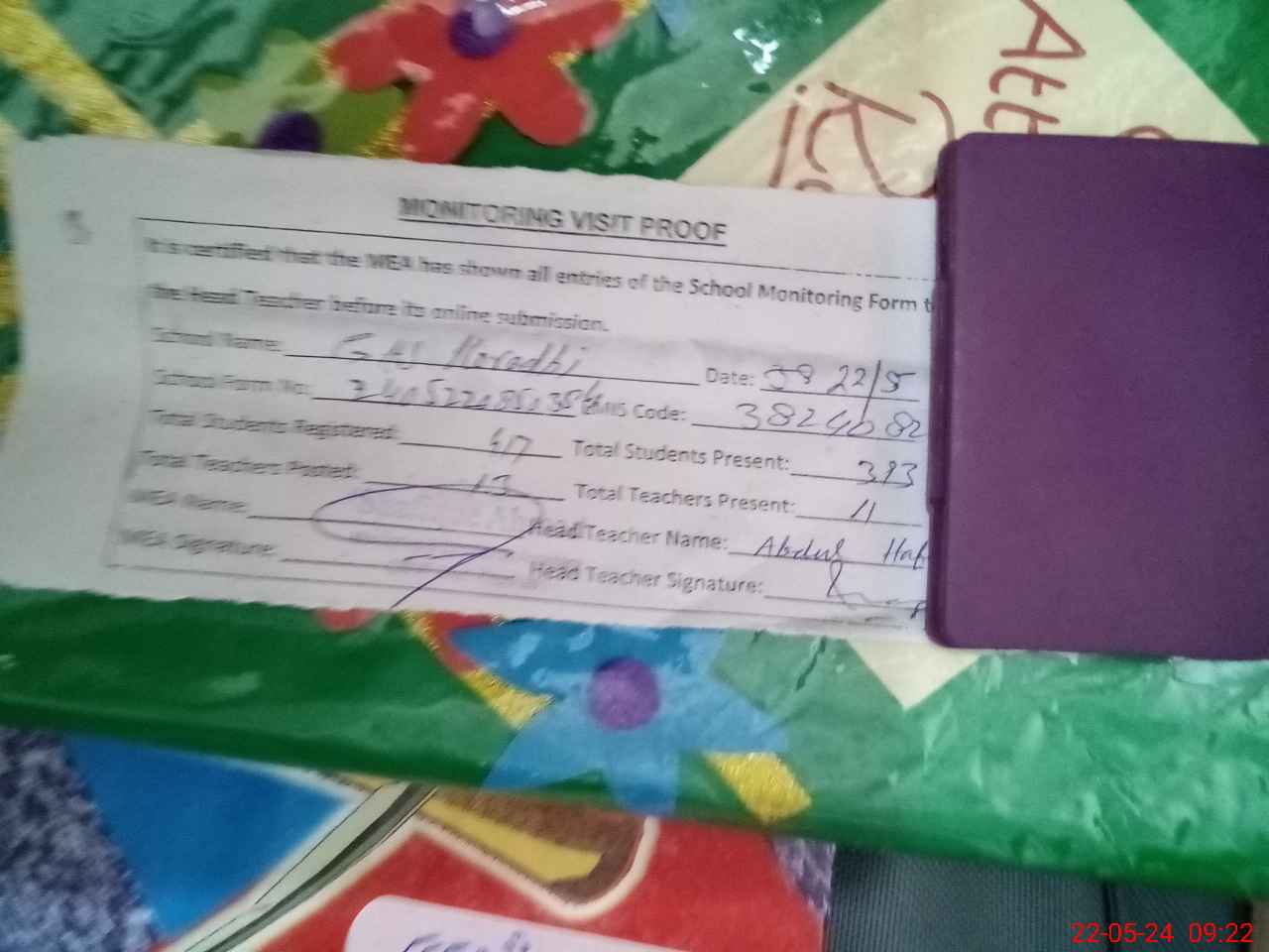 | Attendance Register | Head Teacher | MEA with School | Visit Proof |