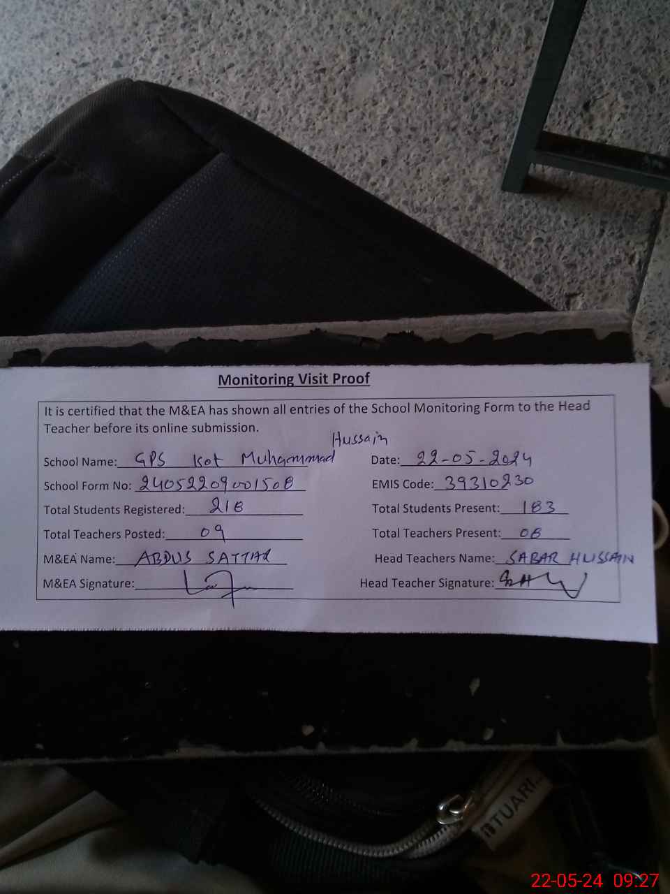 | EMIS Code: 39310230 | Name of School: GPS KOT MUHAMMAD HUSSAIN (HUJRA) | |||
