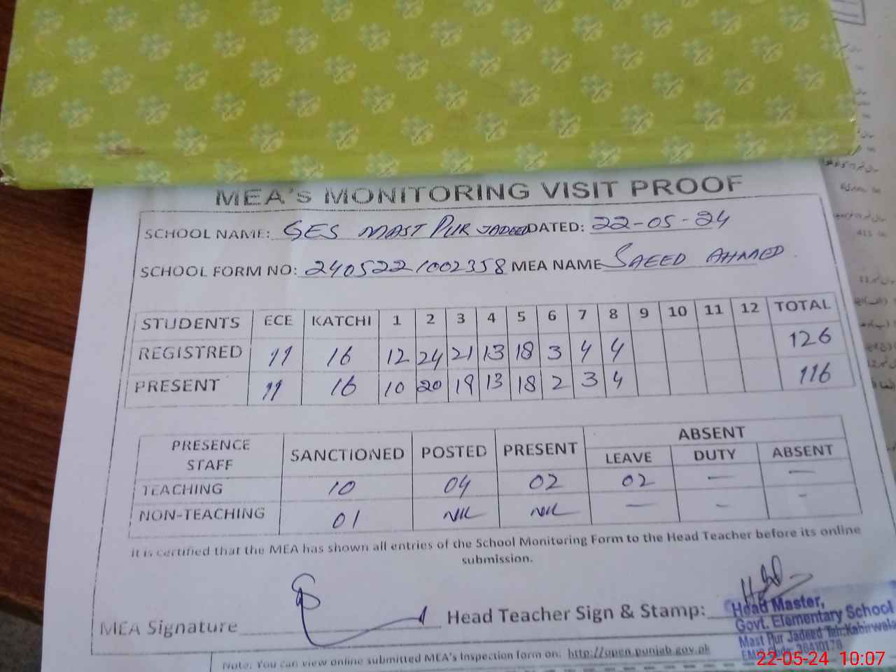 | EMIS Code: 36410176 | Name of School: GES MAST PUR JADEED, P/O BILAWAL PUR, KABIRWALA | |||