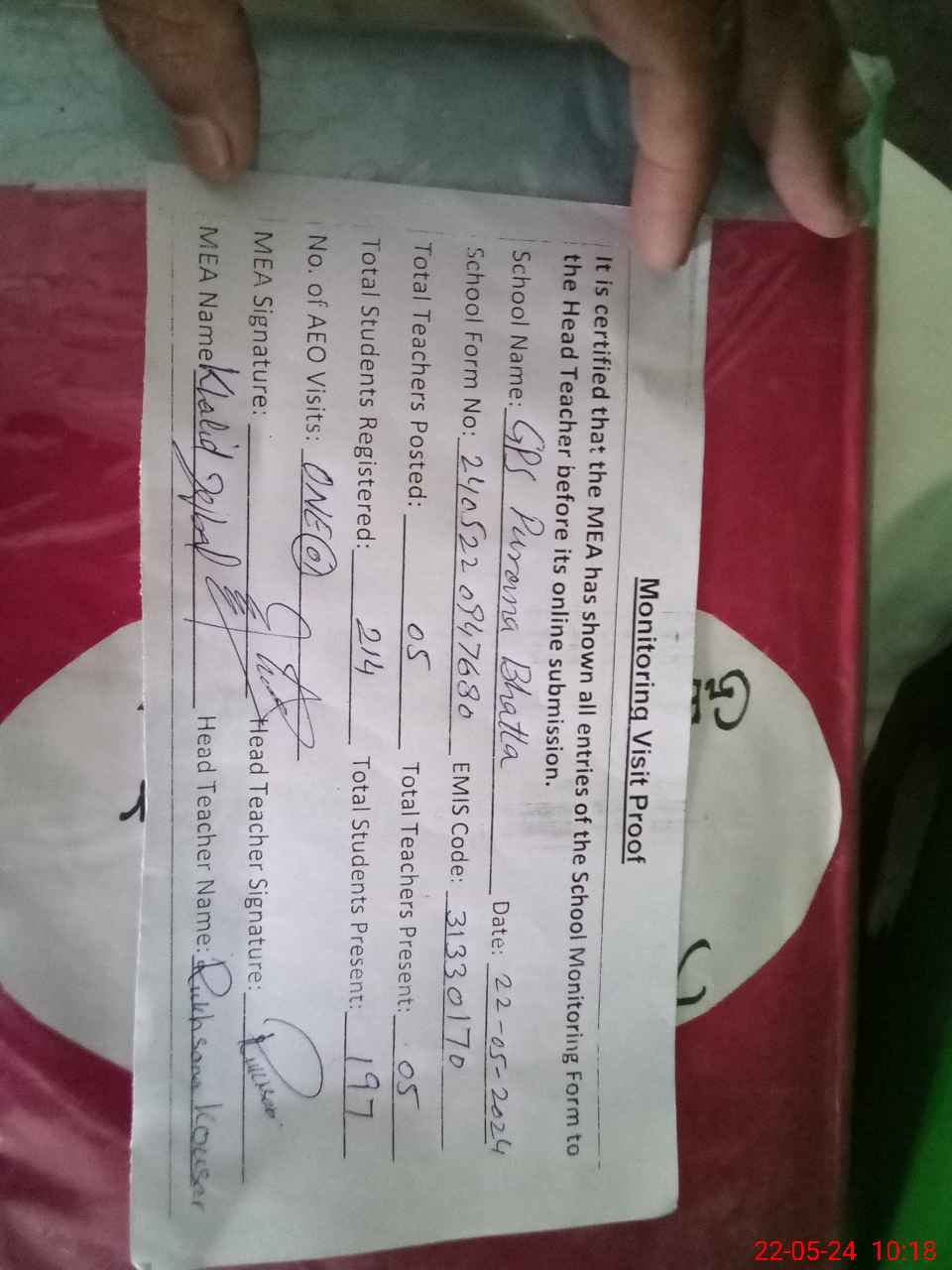 | Remarks (Use Separate Page if Required): Class verification is not updated on MEA tab as per sis and three classes are sitting under shed and roofs and floors of two class rooms are to be major repairs and sevrage system of toilets are to be required repair | |||||