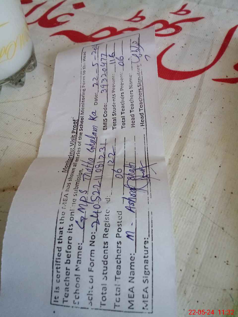 | Attendance Register | Head Teacher | MEA with School | Visit Proof |