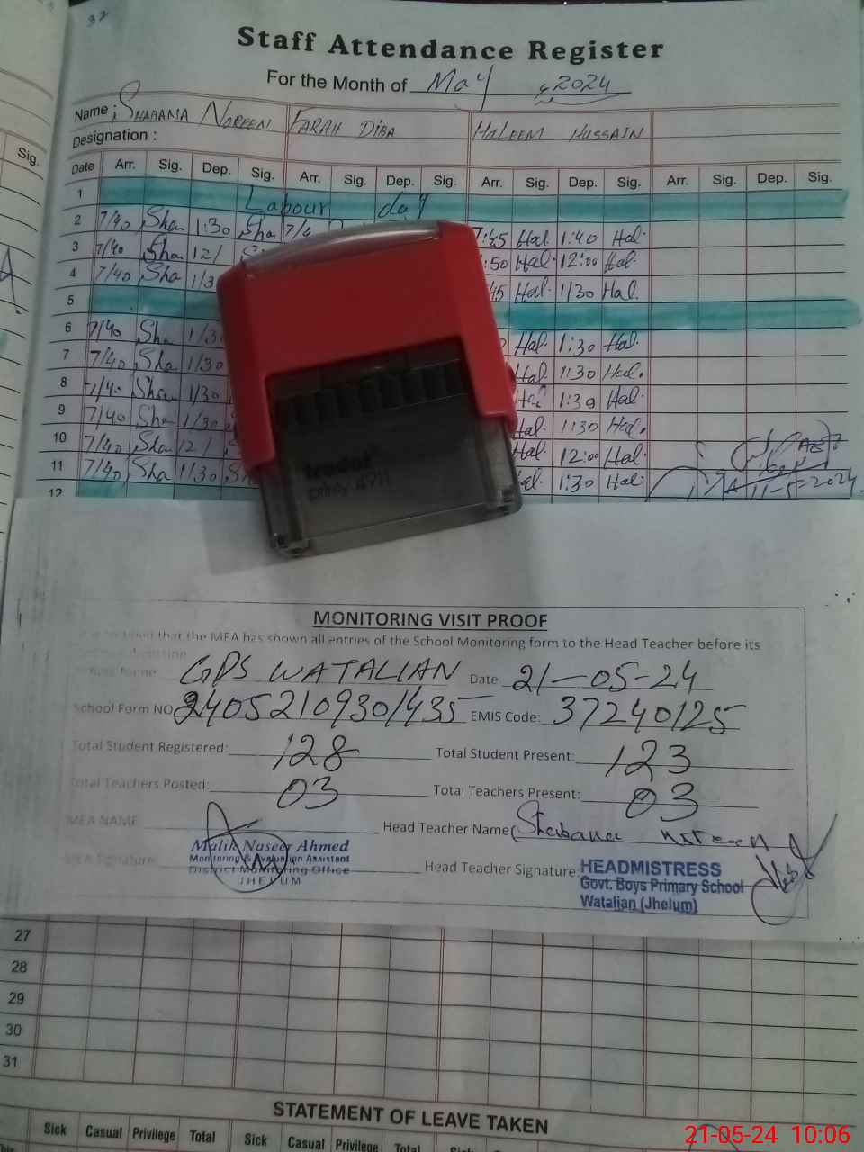 | Attendance Register | Head Teacher | MEA with School | Visit Proof |