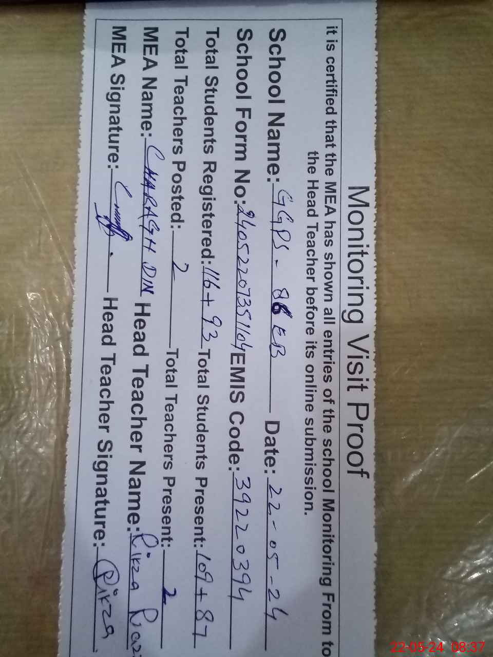 | EMIS Code: 39220394 | Name of School: GGPS 86/EB ARIFWALA | |||