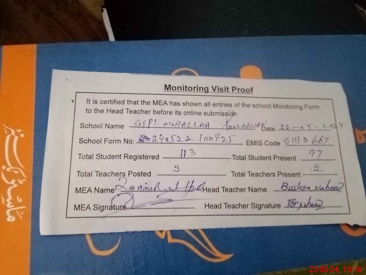 | Attendance Register | Head Teacher | MEA with School | Visit Proof |