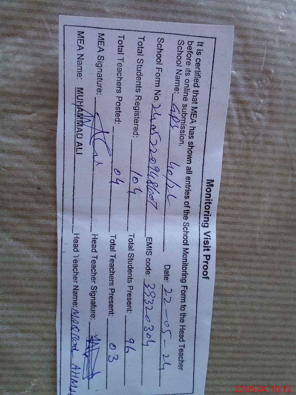 | Certified that this School was Inspected by the Undersigned MEA/DMO Today and the Information Stated Above is as Per Record. | |||||