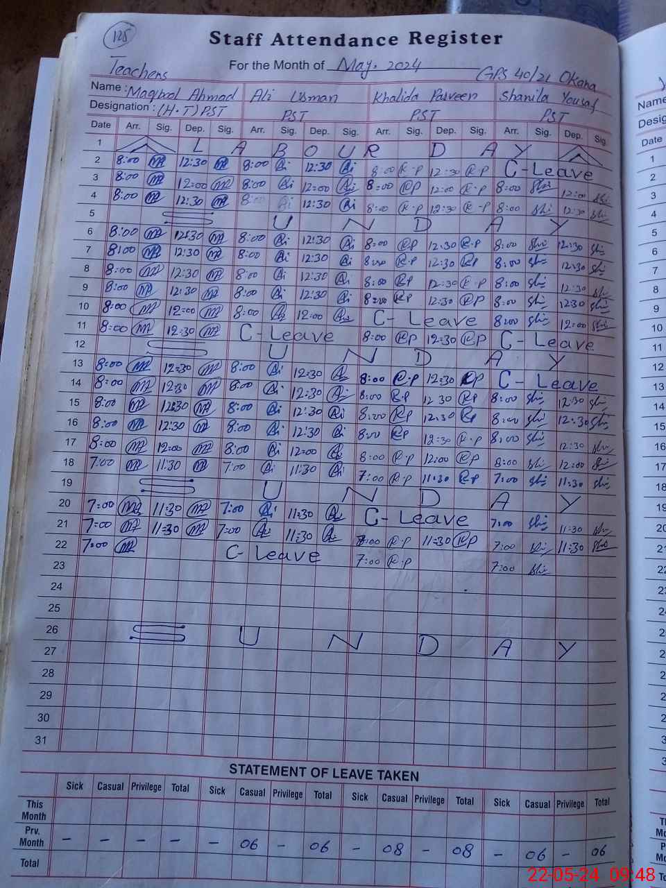 | CNIC | Full Name | Designation | R/C | Absence During Last Calender Month |