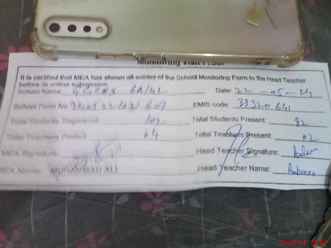 | Monitoring Date: 22-05-2024 | Start Time: 22-05-2024 10:30 AM | End Time: 22-05-2024 10:53 AM | Name of MEA: MO**** AL**** (R**** | |