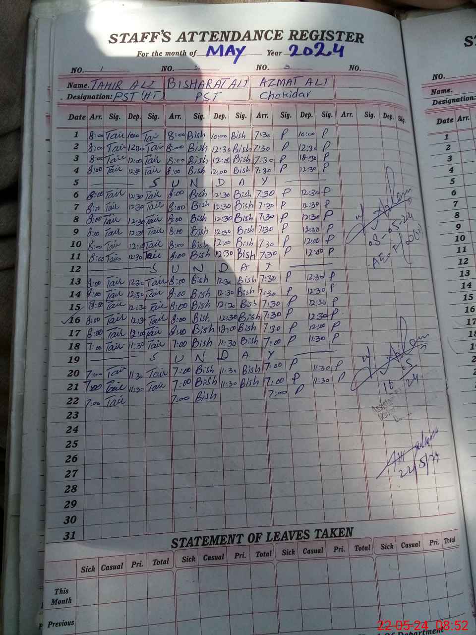 | CNIC | Full Name | Designation | R/C | Absence During Last Calender Month |