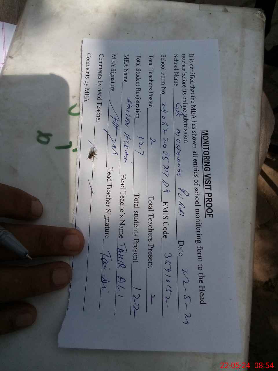 | Attendance Register | Head Teacher | MEA with School | Visit Proof |
