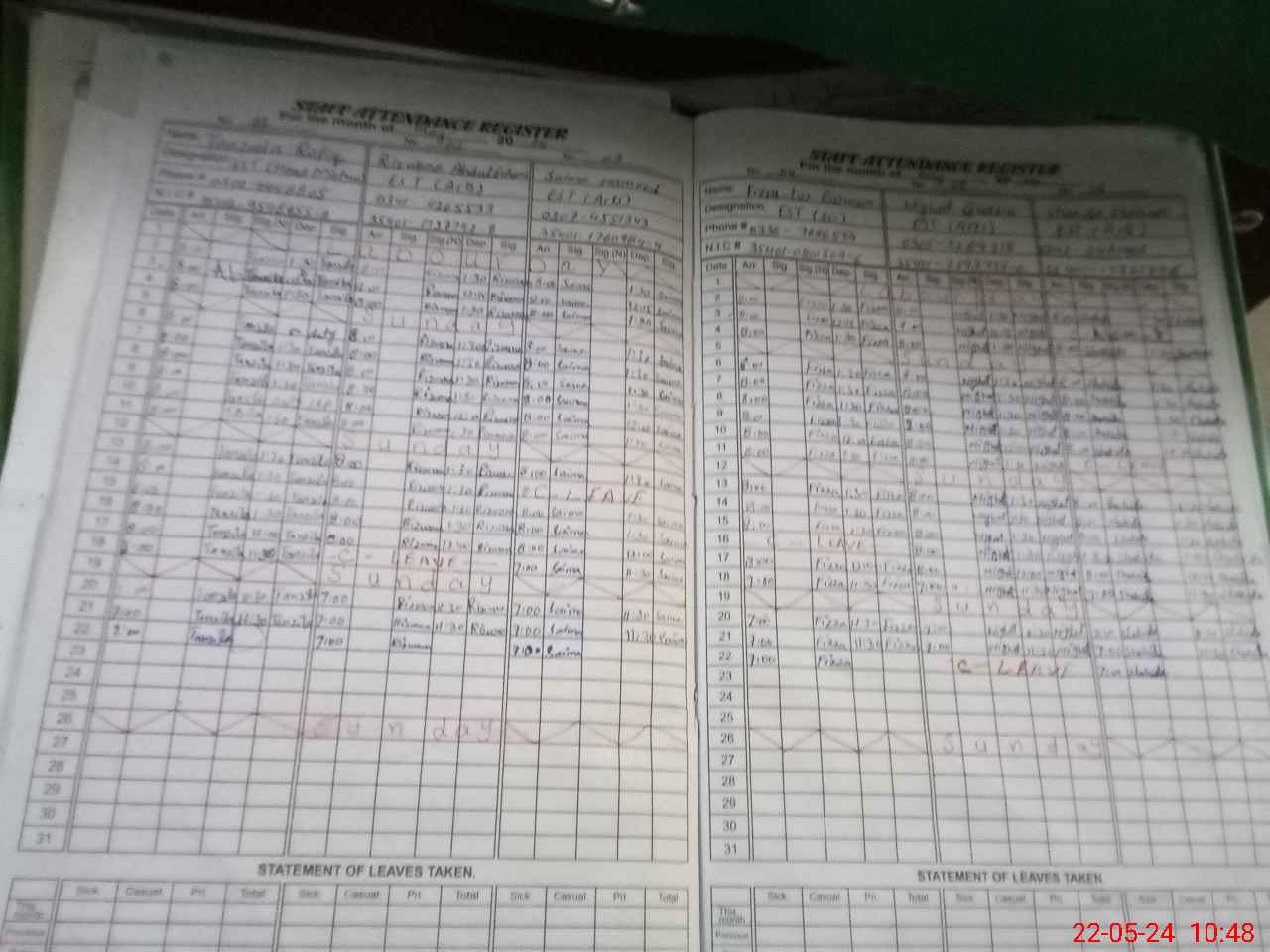| CNIC | Full Name | Designation | R/C | Absence During Last Calender Month |