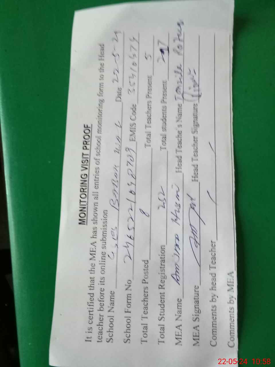 | Attendance Register | Head Teacher | MEA with School | Visit Proof |