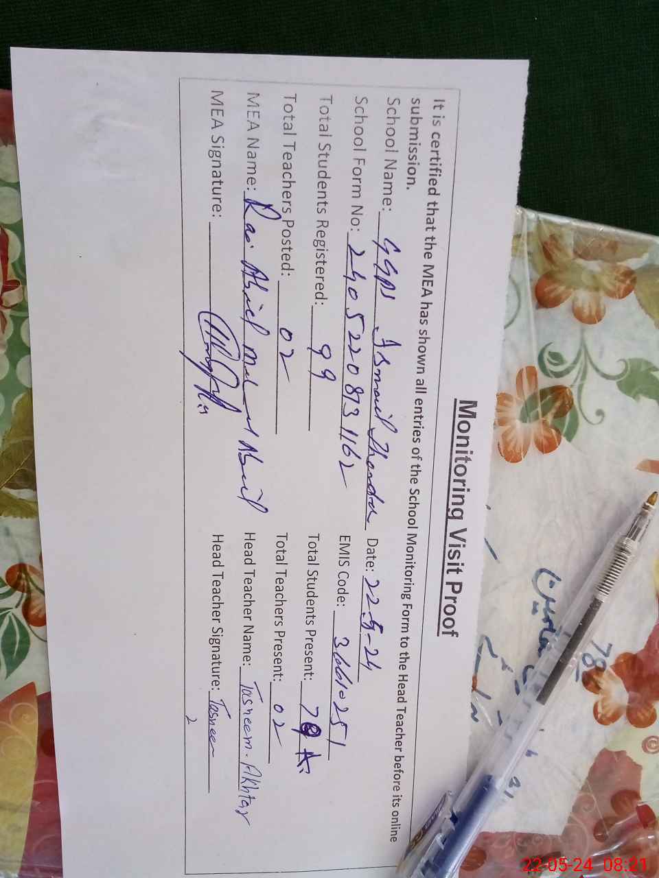 | Certified that this School was Inspected by the Undersigned MEA/DMO Today and the Information Stated Above is as Per Record. | |||||