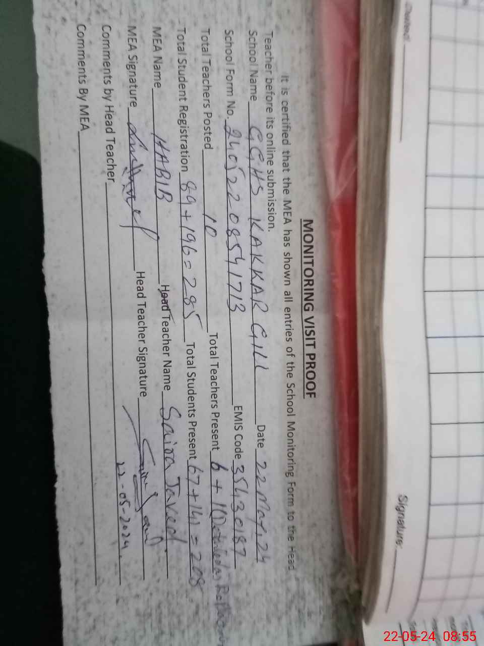 | Attendance Register | Head Teacher | MEA with School | Visit Proof |