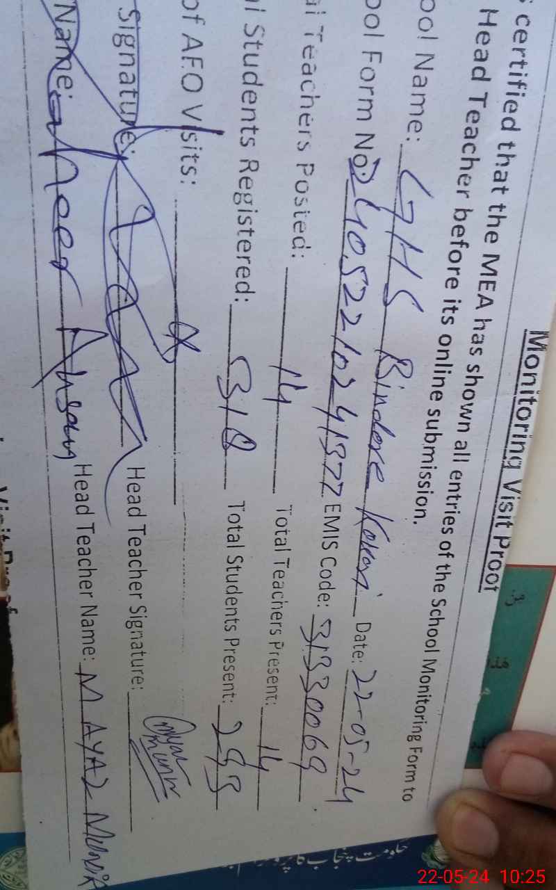 | EMIS Code: 31330069 | Name of School: GHS BINDOOR KOKARI | |||