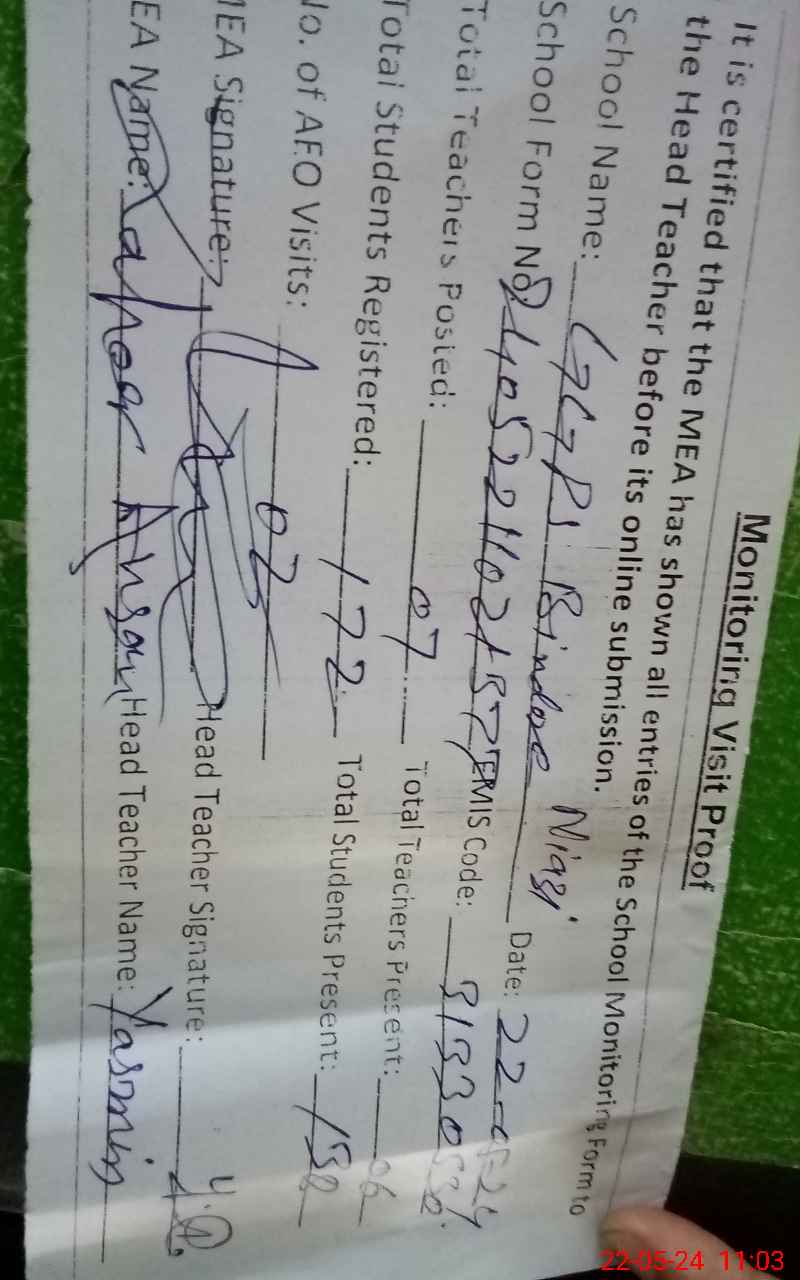 | Attendance Register | Head Teacher | MEA with School | Visit Proof |