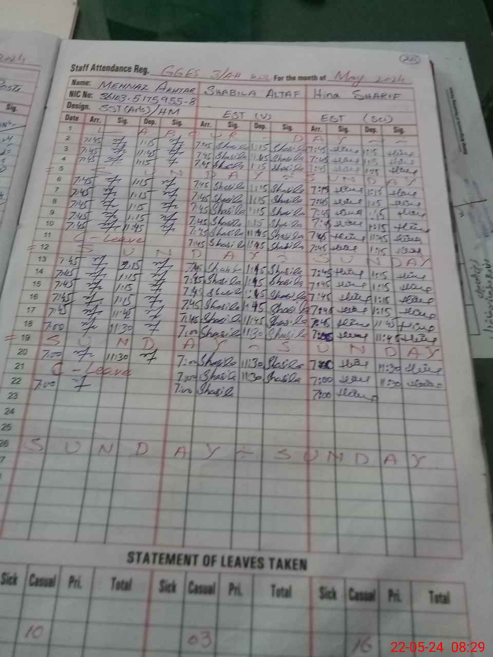 | CNIC | Full Name | Designation | R/C | Absence During Last Calender Month |