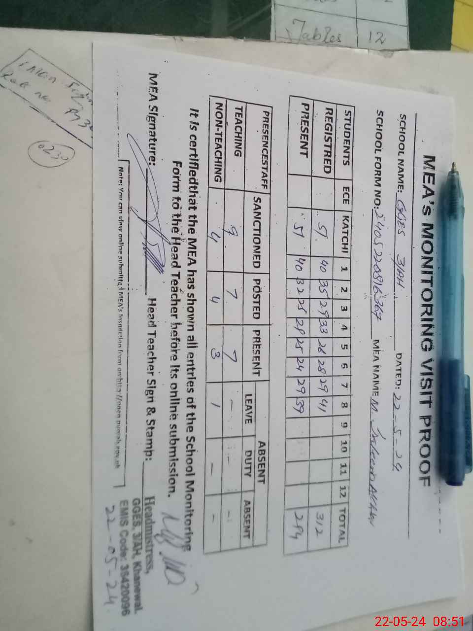 | Attendance Register | Head Teacher | MEA with School | Visit Proof |