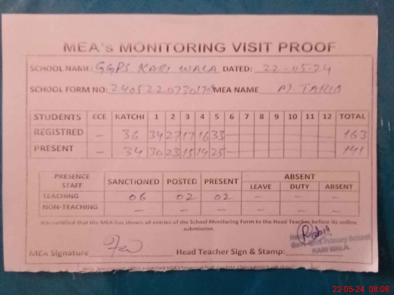 | Attendance Register | Head Teacher | MEA with School | Visit Proof |