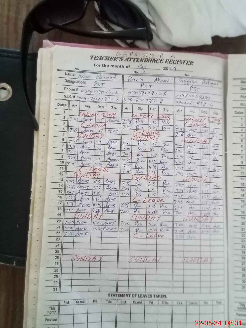| CNIC | Full Name | Designation | R/C | Absence During Last Calender Month |