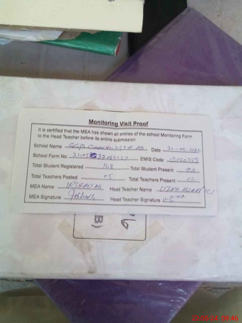 | Attendance Register | Head Teacher | MEA with School | Visit Proof |