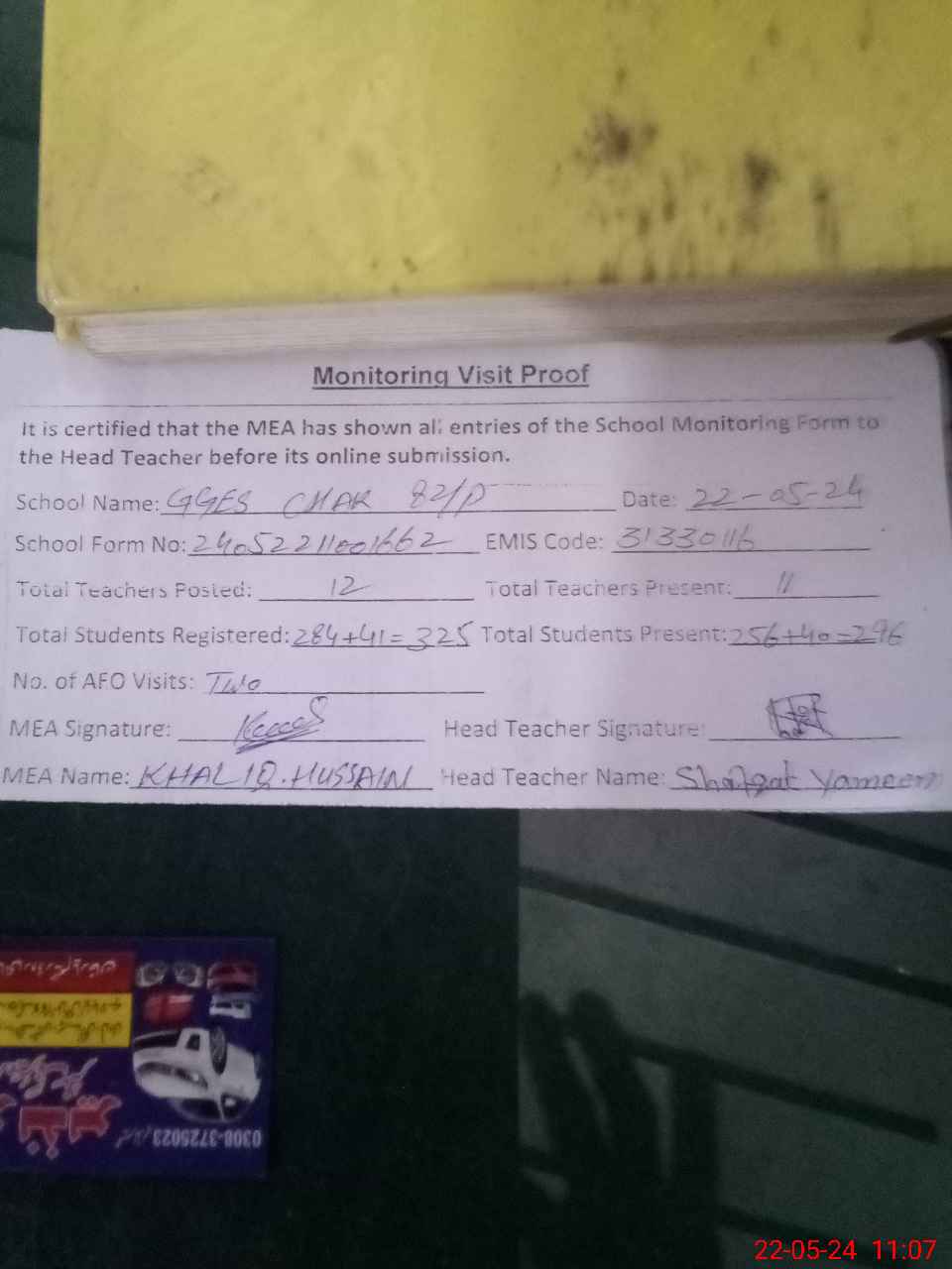 | Attendance Register | Head Teacher | MEA with School | Visit Proof |