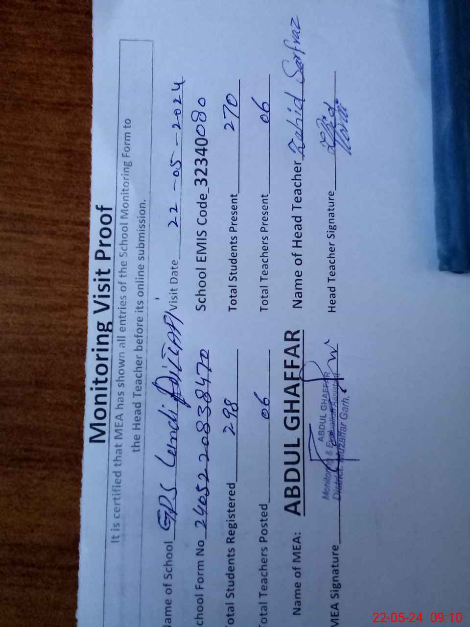 | Certified that this School was Inspected by the Undersigned MEA/DMO Today and the Information Stated Above is as Per Record. | |||||