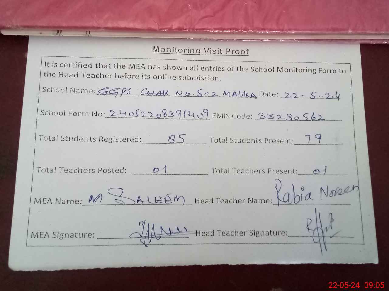 | Attendance Register | Head Teacher | MEA with School | Visit Proof |