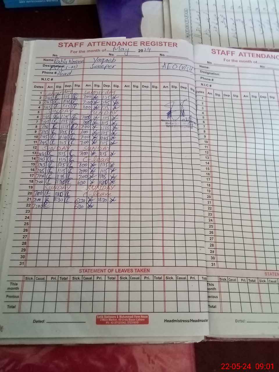 | CNIC | Full Name | Designation | R/C | Absence During Last Calender Month |